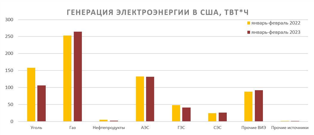 Американский коммунальный сектор продолжает показывать довольно ровную околонулевую динамику с начала 2023 года. Вероятной причиной выглядит аномально теплая погода в осенне-зимний период в США, которая способствовала сильному снижению выработки электростанций, в первую очередь ТЭС. Так, в январе совокупная генерация упала на 7,9% (г/г) с достижением минимальных годовых значений по оптовым ценам на электроэнергию в Новой Англии, Луизиане, Техасе и ряде других штатов, а в феврале показатель выработки снизился на 5,1% (г/г).