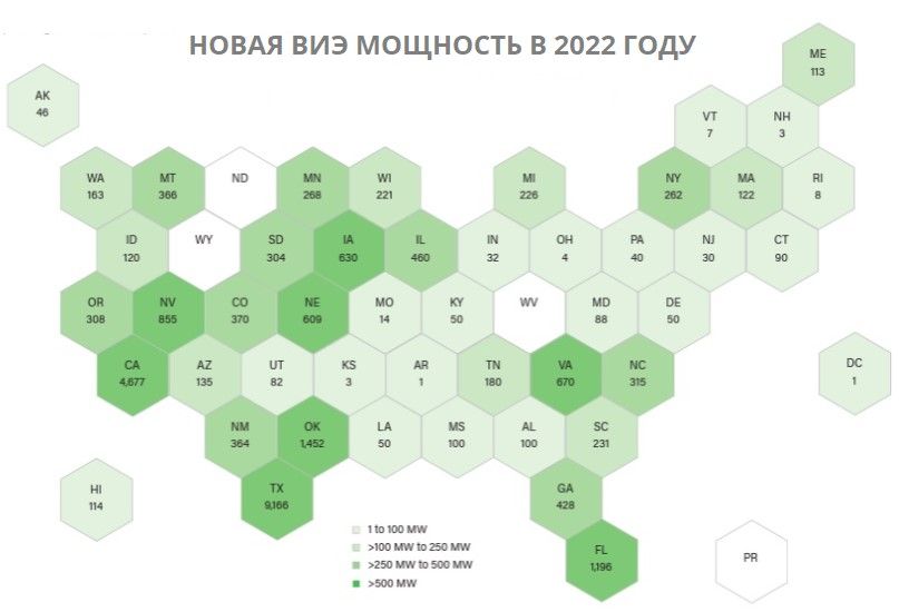 В силу разворачивания Акта о снижении инфляции, принятого в 2022 году и продлившего широкий перечень стимулов для возобновляемой генерации, мы ожидаем, что число штатов, принявших или усиливших "зеленые" стандарты будет расти в ближайшие годы. Уже в 2022 году 30 штатов установили более 100 МВт ВИЭ на своей территории с наиболее высокими показателями в Техасе, Калифорнии, Флориде и Оклахоме. По совокупной мощности проектов в стадии строительства либо проектирования на текущий момент лидируют Техас, Калифорния, Нью-Йорк, Индиана, Вирджиния, Аризона и Иллинойс.