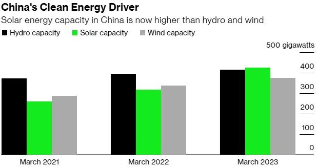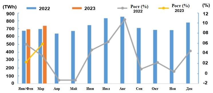 Демонстрируемые возобновляемой энергетикой в стране темпы роста продолжают ошеломлять. По итогам января-февраля 2023 года мощность СЭС подскочила до 413 ГВт (+30,8% г/г), а ВЭС – до 371 ГВт (+11,0% г/г). Это доводит совокупную мощность возобновляемых источников в китайской экономике до 1 199 ГВт, что соответствует 46% всей энергосистемы, а без учета ГЭС ВИЭ пробили отметку в 30% ЕЭС Китая. По информации министерства энергетики страны уже в марте СЭС стали крупнейшим возобновляемым источником электроэнергии в Китае, опередив ГЭС.