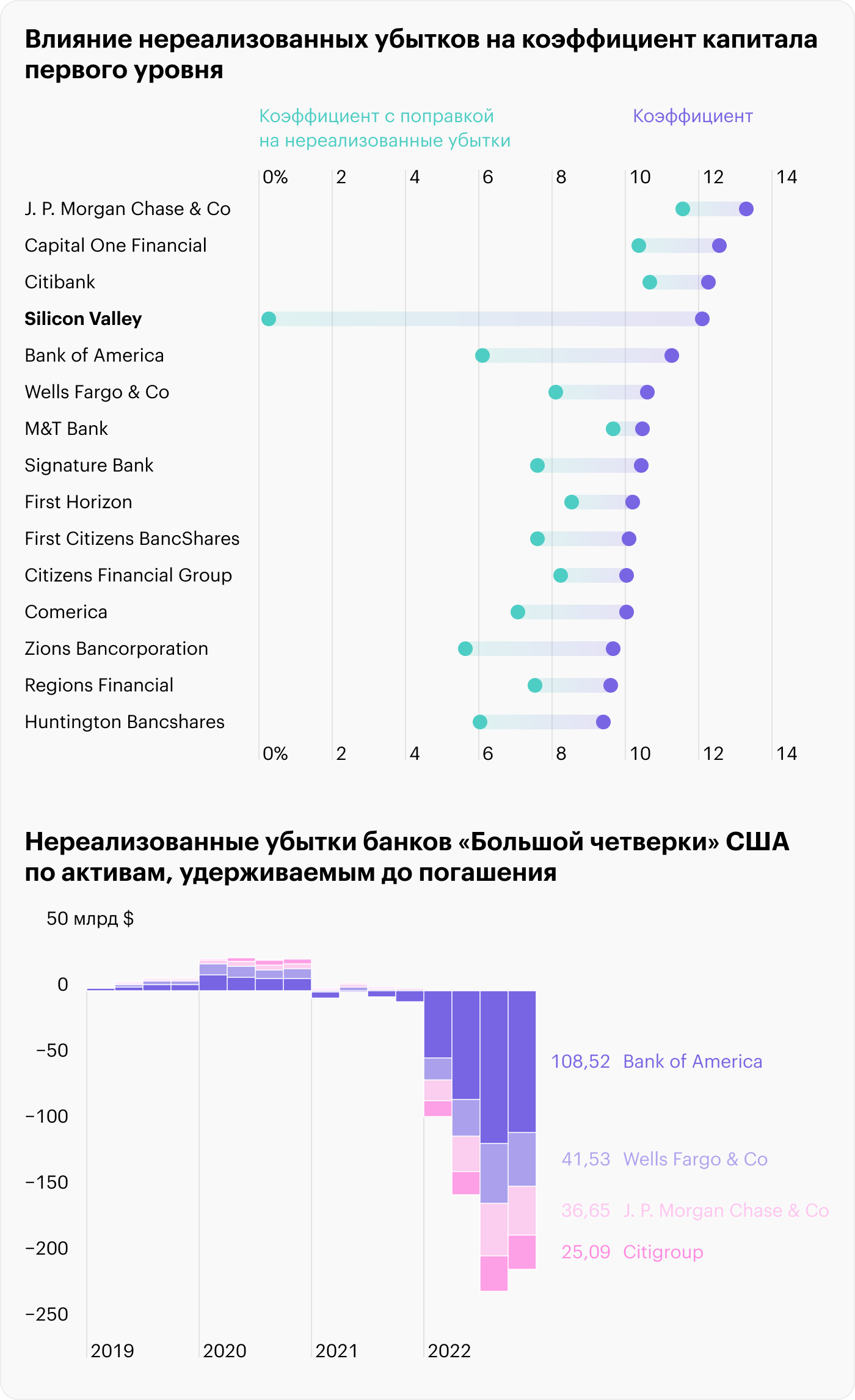У небольших банков эти нереализованные убытки не влияли на коэффициенты капитала первого уровня (CET1). В результате у того же Silicon Valley образовался огромный разрыв в капитале: без учета нереализованного убытка все было в рамках нормативов, но при его учете оказалось, что денег у банка практически нет.