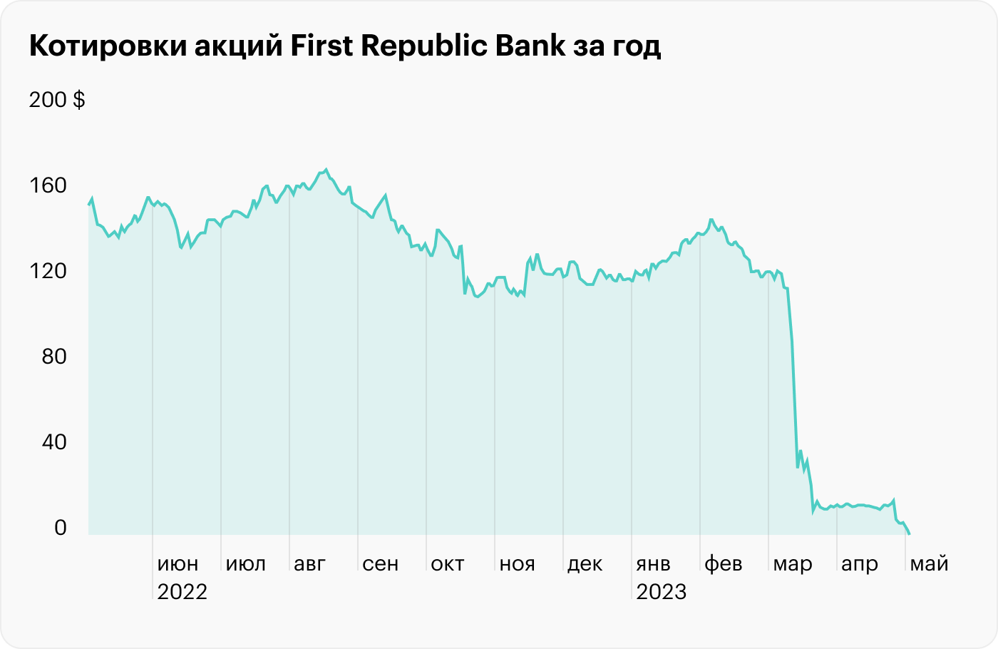 Модель управления активами First Republic Bank была схожа с подходом Silicon Valley Bank: оба они привлекали деньги вкладчиков под низкий процент и держали резервы в ипотечных и государственных облигациях, которые начали падать в цене после роста ставки ФРС.