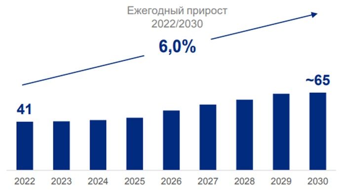 Аэрофлот» прогнозирует рост пассажиропотока авиакомпаний группы до 65 млн человек к 2030 году со среднегодовым темпом роста CAGR на уровне 6%, что позволит обеспечить рост доли рынка (с учетом иностранных авиакомпаний) до 50%.