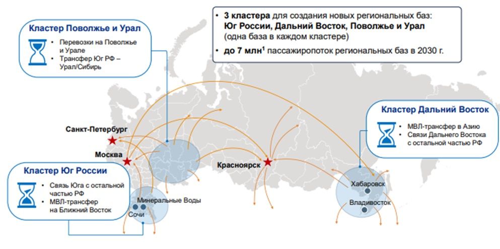 - Для дальнейшего повышения транспортной доступности регионов страны «Аэрофлот» планирует расширить систему региональных баз в дополнение к уже существующему крупнейшему хабу за пределами Москвы в Красноярске. Компания намерена открыть три новые региональные базы в трех кластерах страны: юг РФ, Дальний Восток, Поволжье и Урал. В компании ожидают, что пассажиропоток региональных баз достигнет 7 млн человек без учета рейсов в Москву и Санкт-Петербург.
