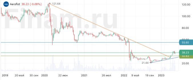 С технической точки зрения на недельном графике акции «Аэрофлота» сломили нисходящих тренд от начала 2020 года и вплотную приблизились к локальному уровню сопротивления. Ближайшая цель — закрепиться выше отметки 55, после чего можно будет ожидать дальнейшего восстановления капитализации. Поддержкой будет выступать уровень 33.