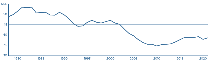 Расходы на личное потребление как доля ВВП Китая с 1978–2021 гг.
