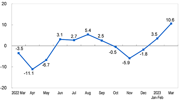 С января по март общий объем розничных продаж потребительских товаров вырос на 5,8% г/г, до 11,5 трлн юаней, значительно улучшившись по сравнению с 2022 годом (снижение на 0,2% г/г). Рост трат в марте ускорился до 10,6% г/г.
