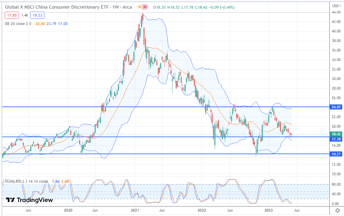 На недельном графике акции CHIQ ETF консолидируются у поддержки в районе $ 18 и выглядят перепроданными. При развороте целью для акций фонда послужит сопротивление у $ 24. На пробитии поддержки возможно снижение к $ 14.