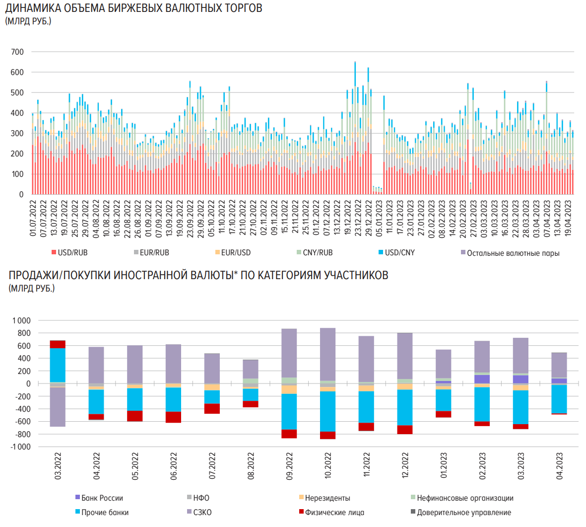 Крупнейшими продавцами валюты на рынке спот оставались системно значимые кредитные организации (СЗКО) как основные агенты по реализации валютной выручки экспортеров. Объем реализованной ими валюты также существенно снизился и составил 390 млрд руб. (в марте – 563 млрд руб.), достигнув минимального значения с сентября 2022 г.