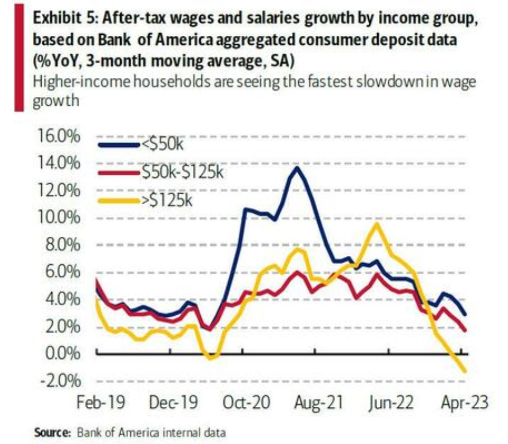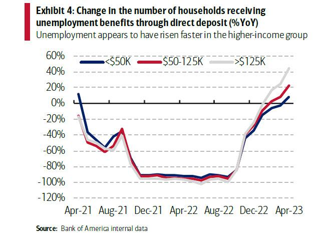 Bank of America подогнал картинку. Изменения числа домохозяйств, получающих пособия по безработице с разделением по достатку. Серая линия - домохозяйства с доходами свыше 125к$. У них самый сильный рост. Безработица растет быстрее всего в группах с высоким доходом.