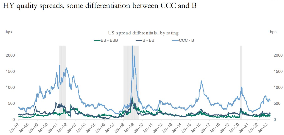 Это спреды, т.е. разности между доходностями бондов компаний с разными рейтингами. К примеру, синий - это разница между ССС и В рейтингами.