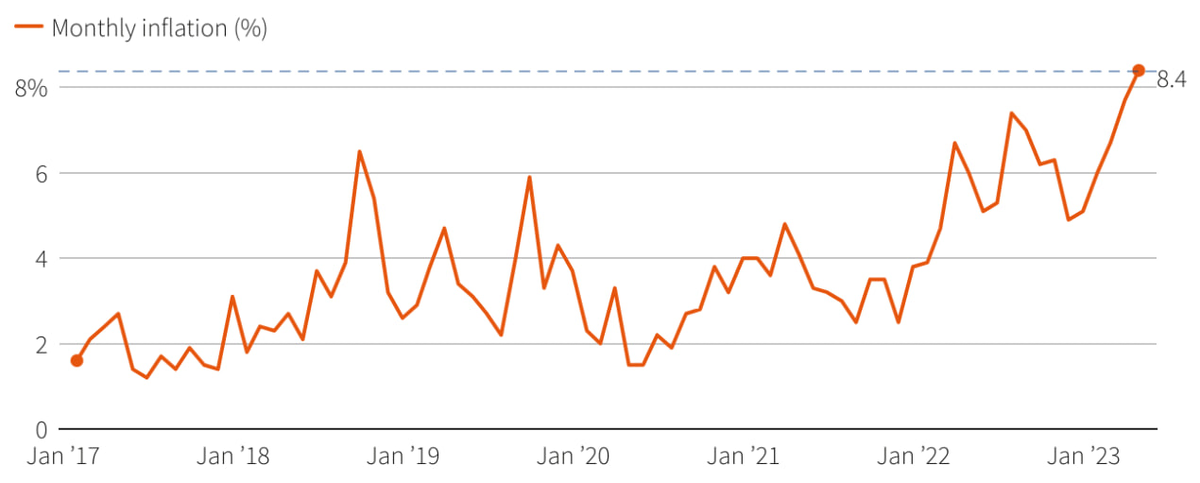 Самая высокая оценка аналитиков в опросе Reuters относительно месячного уровня инфляции в апреле составила 8,3%. "Данные превзошли все прогнозы", - сказал экономист Дэниел Артана из консалтинговой компании FIEL.