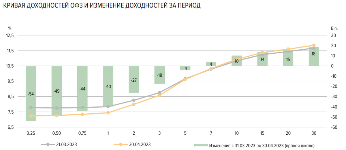 Наклон кривой ОФЗ стал еще более крутым в основном из-за снижения ставок по коротким бумагам, на сроки до двух лет. Это отражает коррекцию вниз ожиданий участников рынка относительно вероятности повышения ключевой ставки. Так рынок мог отреагировать на статистику по текущей динамике инфляции.