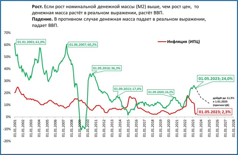 Во-вторых, в 2024 году темпы роста ВВП замедлятся. Если, конечно, ЦБ замедлит рост денежной массы в соответствии со своими прогнозами.