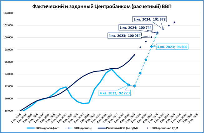 Прогноз ВВП 2023 года будет зависеть от того, как быстро будет фактический ВВП (голубая линия) возвращаться на «заданную» денежно-кредитной политикой траекторию (к тёмно-синей линии и точкам). Рассмотрим возможные сценарии.