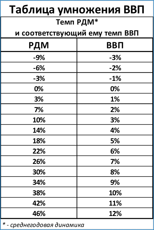 Для первых грубых оценок можно воспользоваться нашей «таблицей умножения ВВП», в которой показано, каким темпам ВВП соответствуют те или иные темпы роста РДМ.