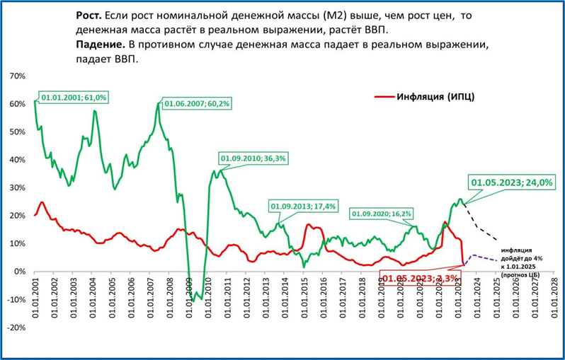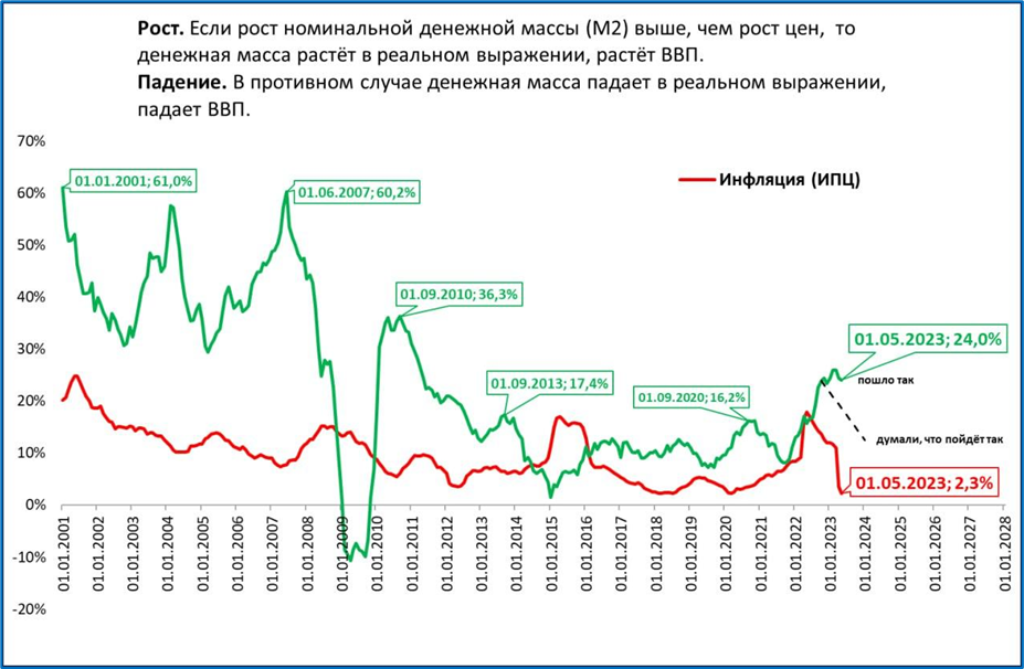 Во-вторых, в 2024 году темпы роста ВВП замедлятся. Если, конечно, ЦБ замедлит рост денежной массы в соответствии со своими прогнозами.