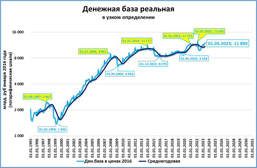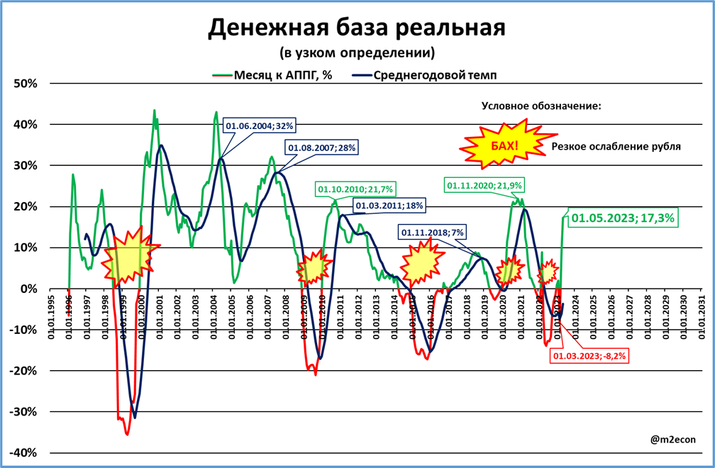 Итак, мы посчитали, какой будет реальная денежная масса до конца 2024 года, учитывая фактические данные до 1 мая 2023 года и прогноз ЦБ.