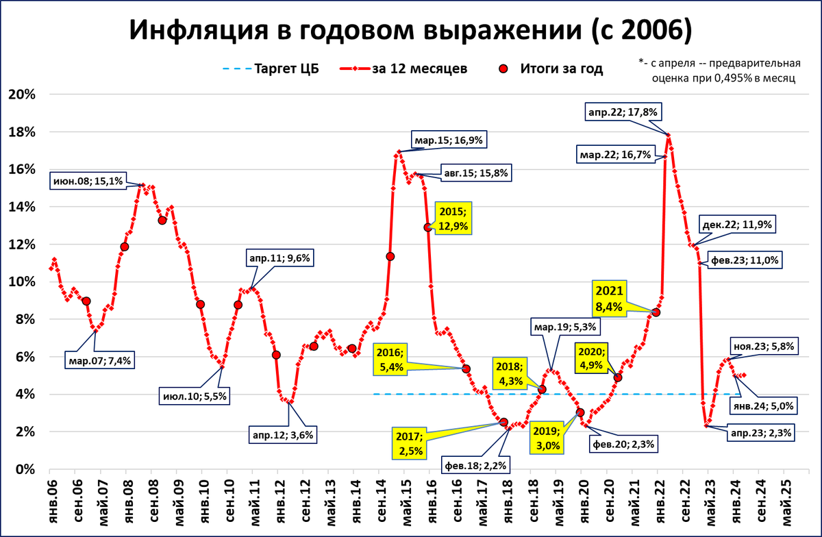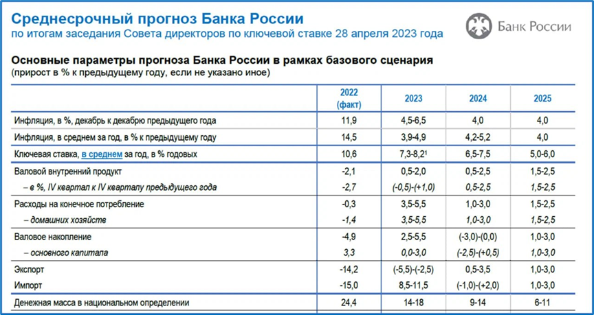 Прогноз ЦБ предполагает инфляцию по итогам 2023 года на уровне от 4,5 до 6,5% годовых.