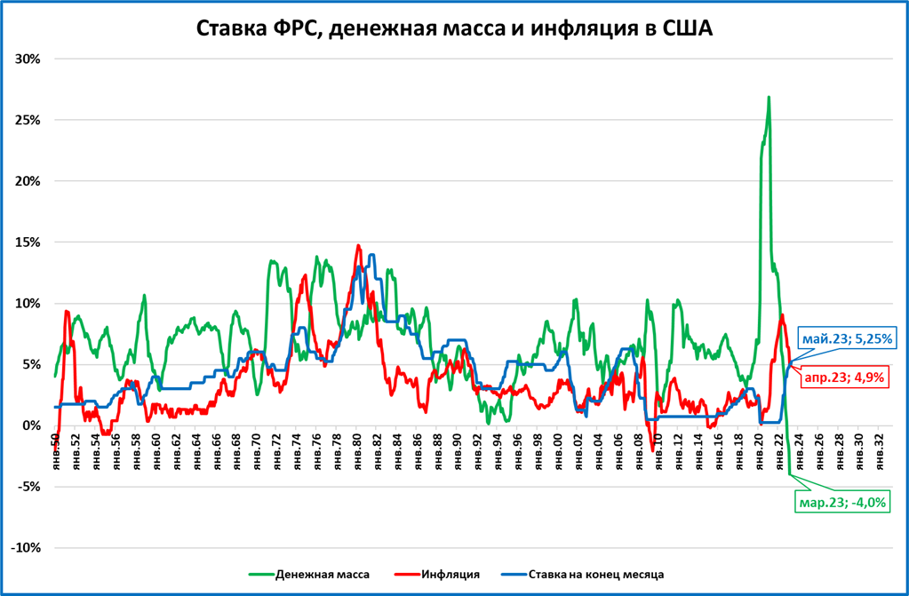 ● Инфляция в США в апреле снизилась до 4,9%. ФРС повысила ставку до 5,25%. При всём этом реальная денежная масса продолжает сжиматься.