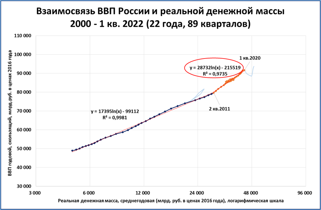 2. Расчётные данные по ВВП, который «задан» динамикой реальной денежной массы. Это тёмно-синяя линия (по фактическим данным РДМ) и тёмно-синие точки (по прогнозу РДМ, сделанному нами выше).