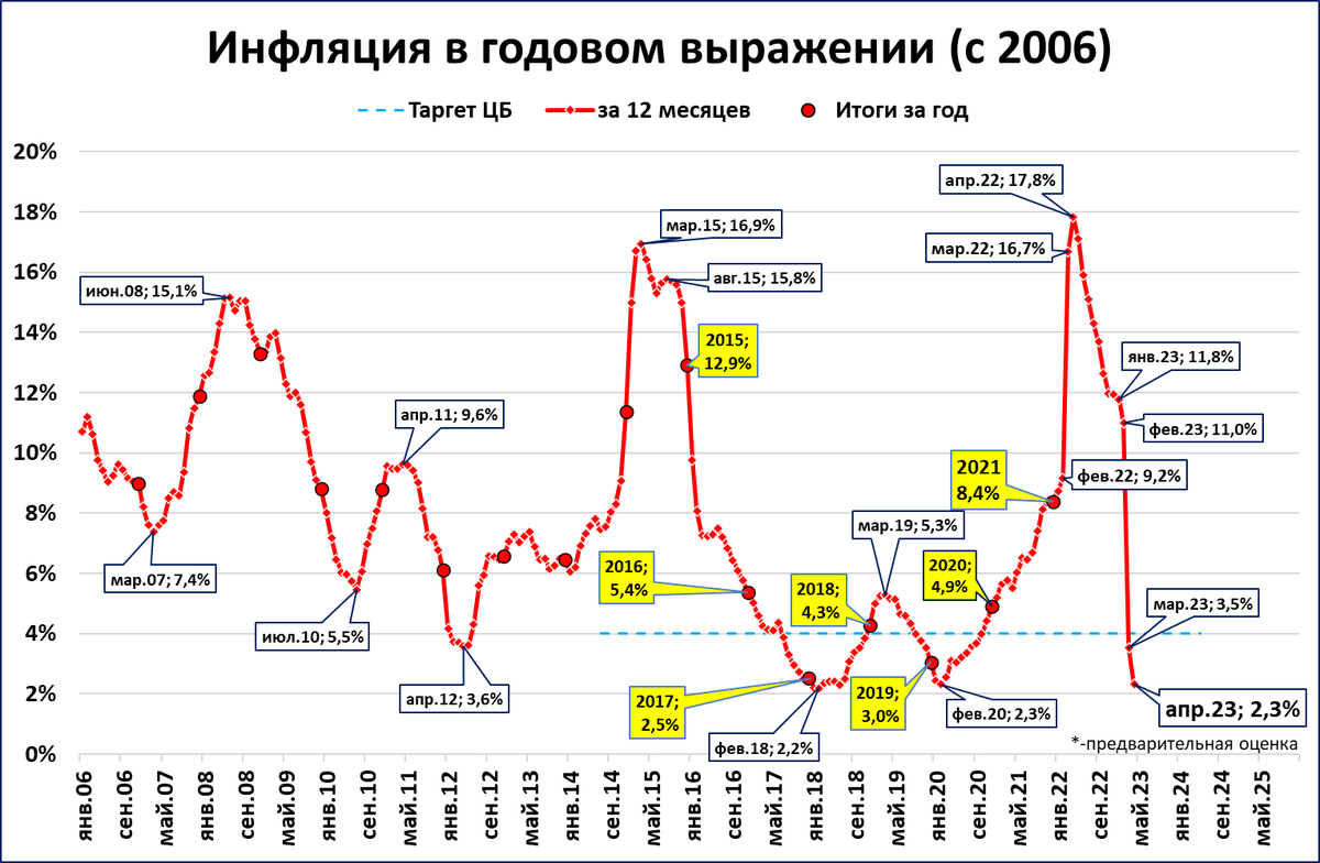 ● Инфляция в апреле опустилась до 2,3% годовых. Такой низкий уровень за последние десятилетия наблюдался лишь дважды: в 2018 и 2020 годах.