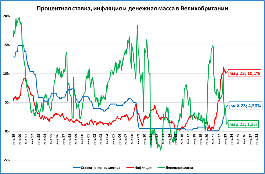 ● Банк Англии поднял ставку до 4,5%, но это существенно ниже инфляции (10,1%). Реальная денежная масса продолжает сокращаться.