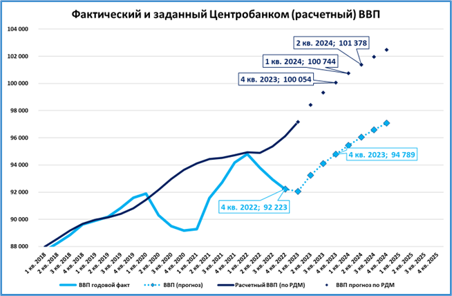 Прогноз ВВП 2023 года будет зависеть от того, как быстро будет фактический ВВП (голубая линия) возвращаться на «заданную» денежно-кредитной политикой траекторию (к тёмно-синей линии и точкам). Рассмотрим возможные сценарии.