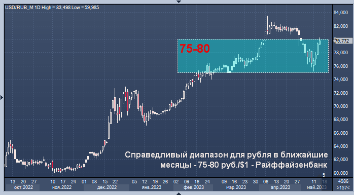 "Несмотря на укрепление торгового баланса, выступающего на стороне более сильного российского рубля, курс в апреле ослаб в среднем более чем на 6% м./м. Так, до апрельского налогового периода и волны укрепления в начале мая рубль был выше 81 руб./$1, а с начала мая находится в диапазоне 75-80 руб./$1.
