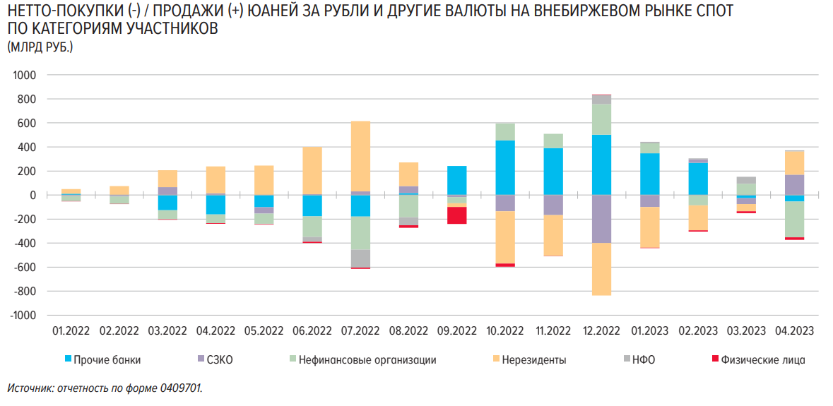 С октября 2022 г. ускорился приток юаней на российский рынок за счет экспортеров, при этом сохранялся спрос на данную валюту со стороны компаний для оплаты импорта. В результате основными поставщиками юаней на биржевом рынке стали работающие с экспортерами СЗКО. До марта 2023 г. в качестве нетто-покупателей юаней на внебиржевом рынке выступали нерезиденты, в апреле 2023 г. основными покупателями стали нефинансовые компании. Данные покупки в основном использовались в целях оплаты импорта.