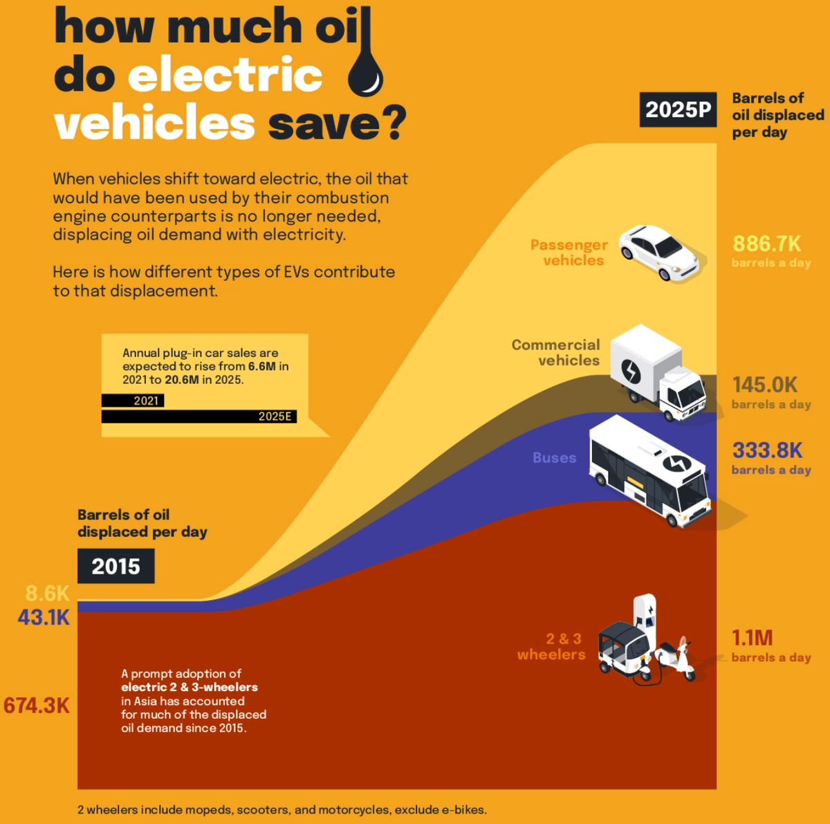 Прекрасное электрическое будущее ждет нас. Только вдумайтесь, к 2025 году замещение варварских машин с двигателями внутреннего сгорания машинами богоугодными зелеными с двигателями электрическими уберет из потребления 886,7 тысяч баррелей ежесуточно. Мопедики и скутеры освободят 1,1 млн барр. в день.