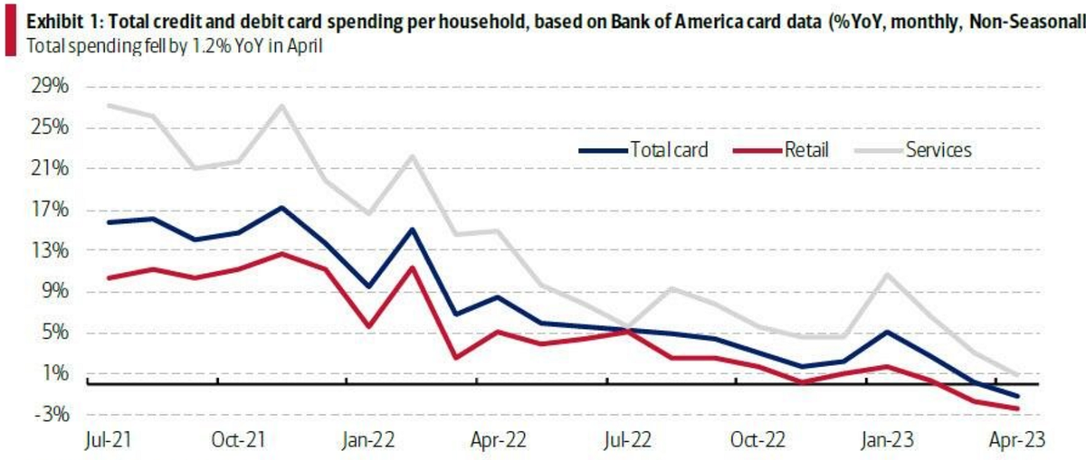 В целом траты по картам по данным Bank of America замедляются давно. А вот с марта уже пошло не замедление, а снижение трат, т.е. уход в отрицательную зону в годовом исчисление.