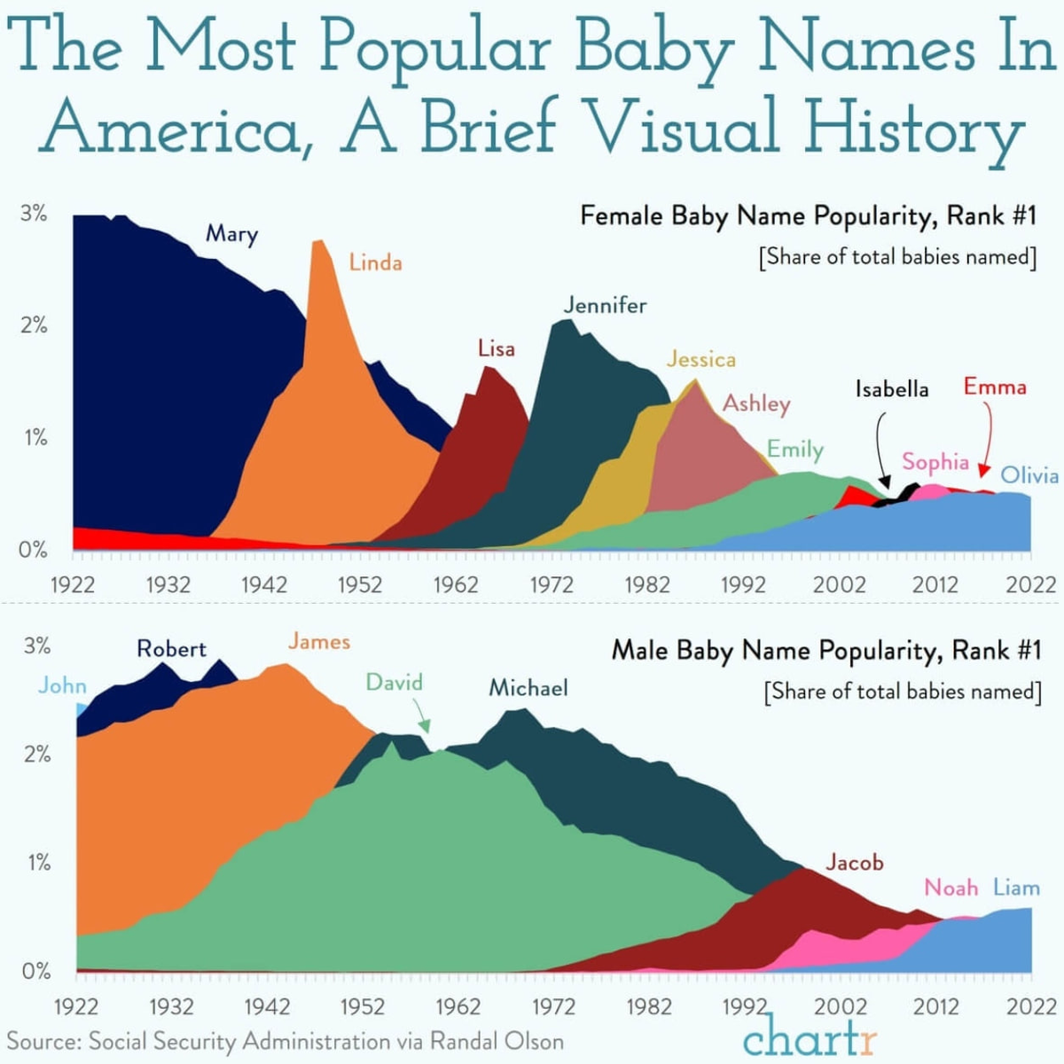 Интересно, как в целом снижается процентная доля самого популярного имени за 100 лет.