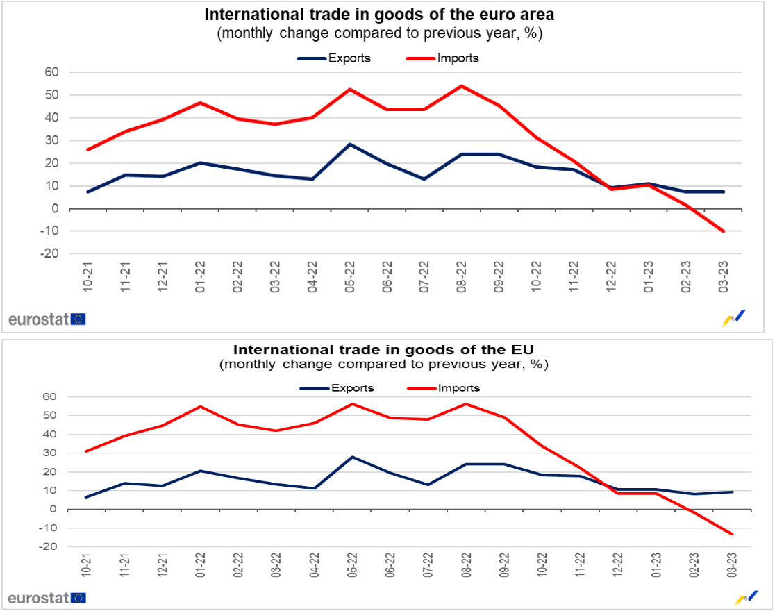 По первой оценке за март 2023 экспорт еврозоны составил 269,2 млрд евро (на 7,5% больше, чем в марте 2022). Импорт же показал цифру 243,6 млрд евро (на 10% меньше, чем в марте 2022). Таким образом в марте 2023 случился торговый профицит в размере 25,6 млрд евро.