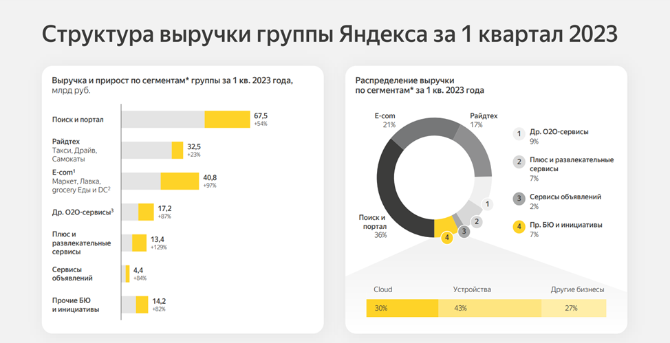 Основные деньги компании приносит сегмент «Портал и поиск». Яндекс смог подмять под себя рынок интернет рекламы после ухода основных конкурентов. Также прибыльным является Райдтех. Главная точка роста – это электронная коммерция. Этот сегмент очень быстро растет. За год рост выручки почти удвоился и превысил 40 миллиардов за квартал. Но естественно, что это направление сейчас и самое убыточное.