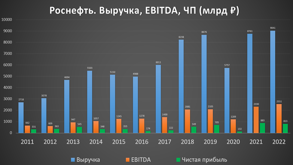 Из-за геополитических событий, Роснефть опубликовала усеченные данные. Учитывая непростые обстоятельства прошлого года, результаты получились отличными. Благодаря высоким ценам на нефть, выручка и EBITDA рекордные. Чистая прибыль также достойная.