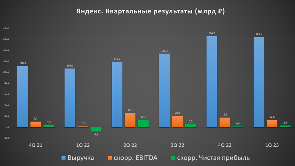 Мы не так давно подробно рассматривали отчет за первый квартал 2023 года. Выручка выросла на 54% год к году. Правда, если сравнивать с рекордным 4 кварталом прошлого года, то выручка снизилась на 1%. Это из-за того, что 4 квартал, как правило, всегда сильный. Еще заметно снижение EBITDA третий квартал подряд.