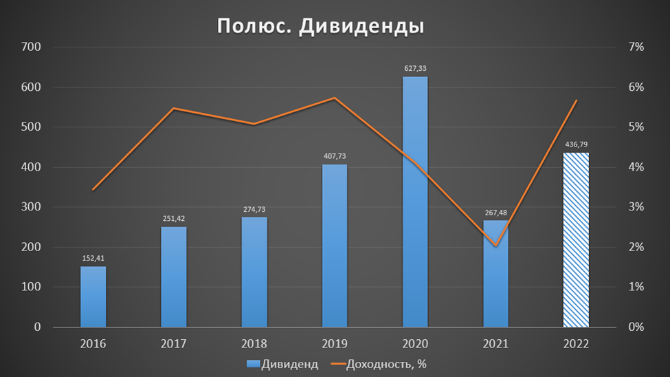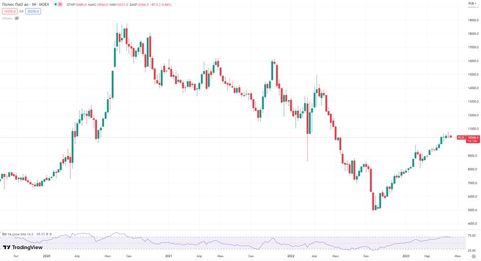 11 мая совет директоров рекомендовал дивиденды по итогам 2022 года в размере 436 рублей. Это чуть больше 4% к текущей цене акции. Дата отсечки 16 июня. Учитывая обстоятельства и тяжелый год, выплата дивидендов – это позитив для Полюса.