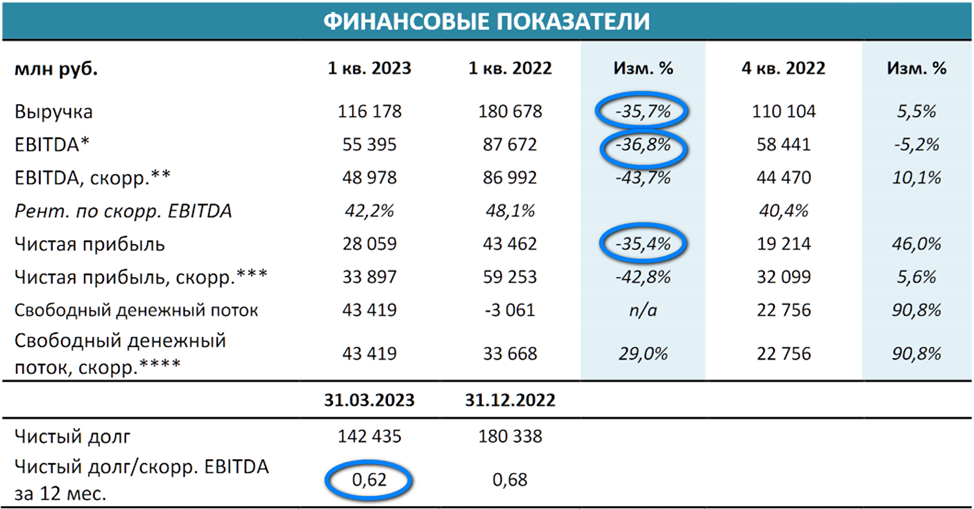 И это привело к ухудшению финансовых результатов. В первом квартале 2023 года выручка, EBITDA и чистая прибыль снизились на 35% год к году. ND/EBITDA = 0,6. Финансовое положение устойчивое.