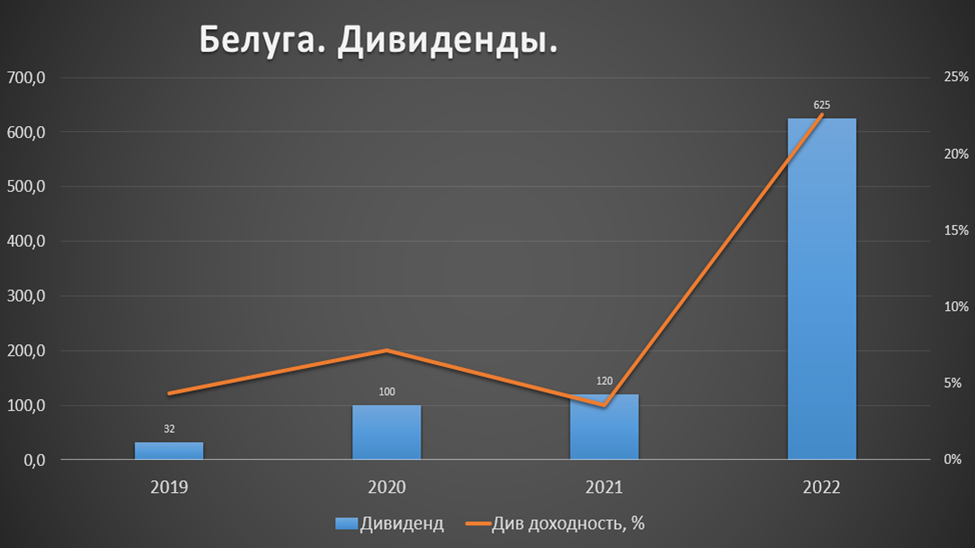 При этом компания старается дважды в год выплачивать дивиденды. Итоговая доходность за 2022 год составила 625₽. Это около 15% доходности к текущей цене акций. Но скорей всего такие большие дивиденды – это разовая история, связанная с получением денег от продажи международных прав на флагманский бренд Beluga.