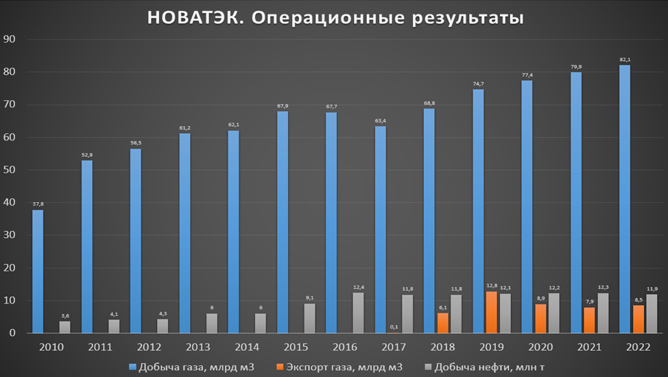Добыча газа на рекордных значениях. Экспорт газа лучше, чем в 2021 году. Добыча нефти более-менее стабильна последние семь лет. Т.е. годовые производственные результаты достаточно позитивны. Несмотря на геополитические трудности, неразрешимых проблем у Новатэка пока не возникло. И даже наоборот, поставки в Европу выросли.