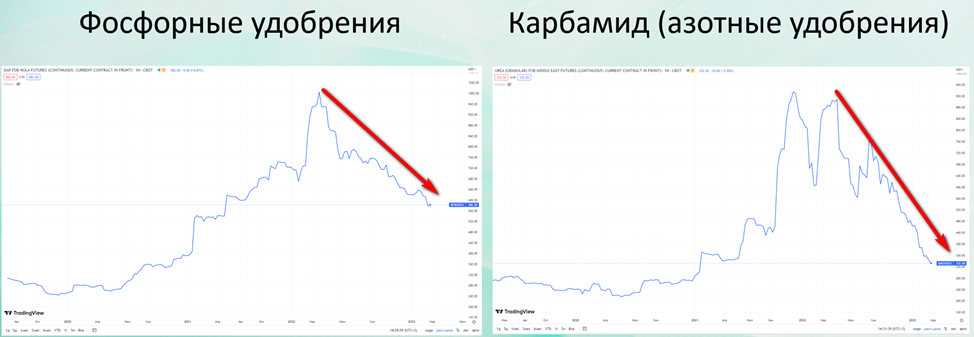 В основном благодаря ценам на фосфорные и азотные удобрения, которые в среднем были значительно выше год к году. Правда, на графике видно снижение цен, начиная с лета 2022 года.