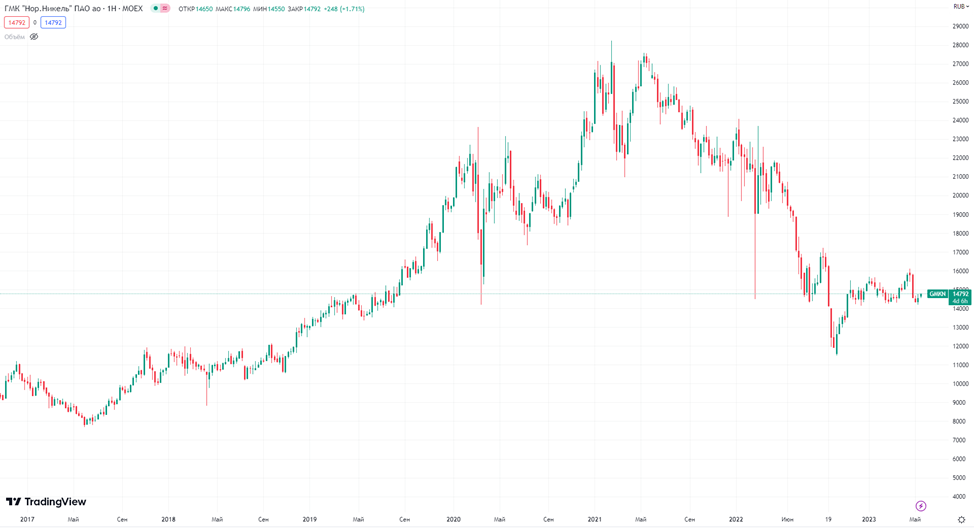 Акции с максимумов упали в два раза. И уже 8 месяцев торгуются в боковике. Текущие цены, а тем более возможная коррекция в этих акциях будет прекрасной возможностью купить НорНикель в долгосрочный портфель. Т.к. рано или поздно трудности уйдут, инвест программа сократится, и компания снова сможет платить неплохие дивиденды.