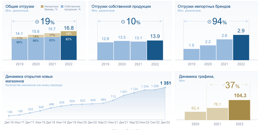 Высокие финансовые результаты базируются на устойчивых операционных показателях. Выросли продажи как собственной продукции, так и импорта. Ну а главное, - на треть выросло число магазинов Винлаб.