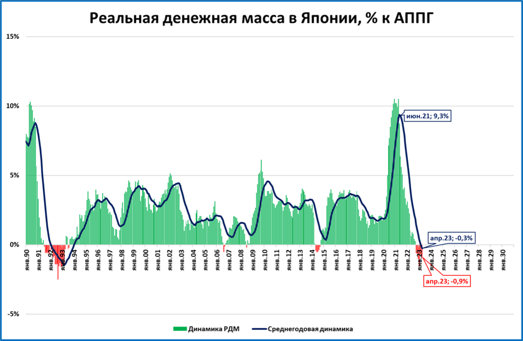Мы по-прежнему ожидаем замедления и последующего снижения ВВП Японии, основываясь на динамике реальной денежной массы.