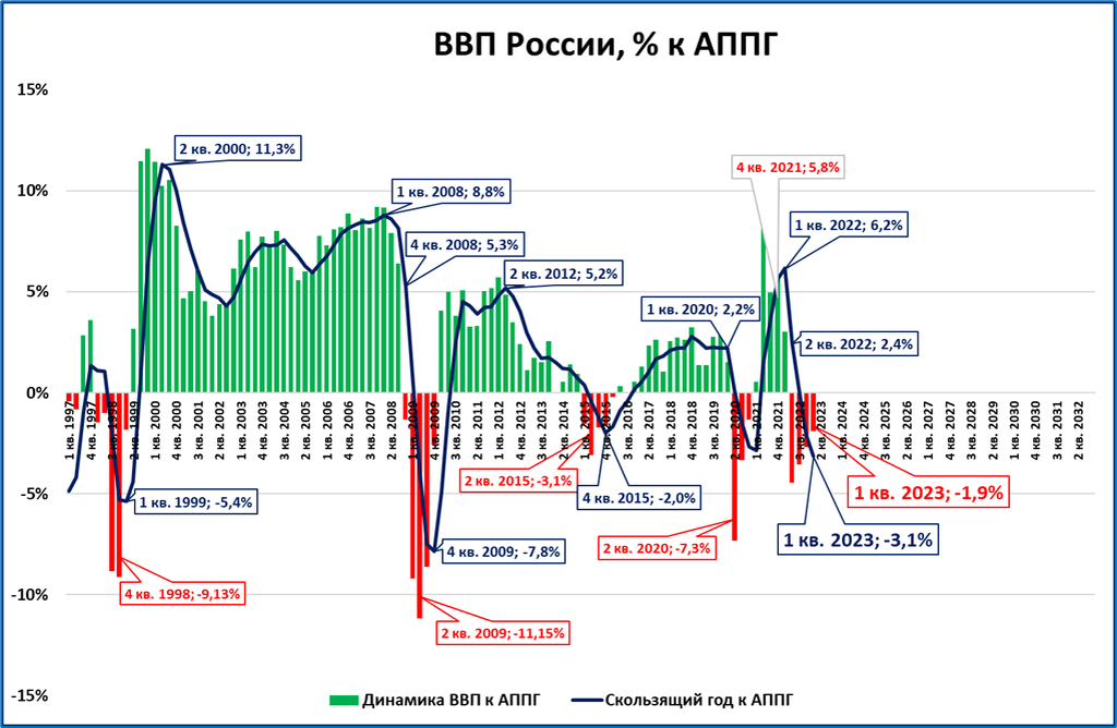 ● ВВП в 1 квартале 2023 года сократился на 1,9%. Это лучше прогнозов МЭР (-2,2%) и ЦБ РФ (-2,3%).