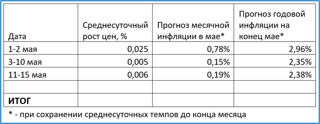 Если такой среднесуточный рост цен сохранится до конца месяца, то по итогам мая инфляция составит 2,38% годовых.