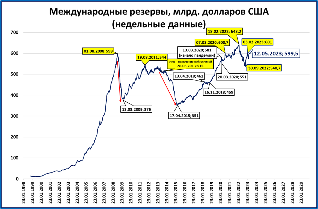 На 12 мая международные резервы (ЗВР) составили 599,5 млрд долларов.