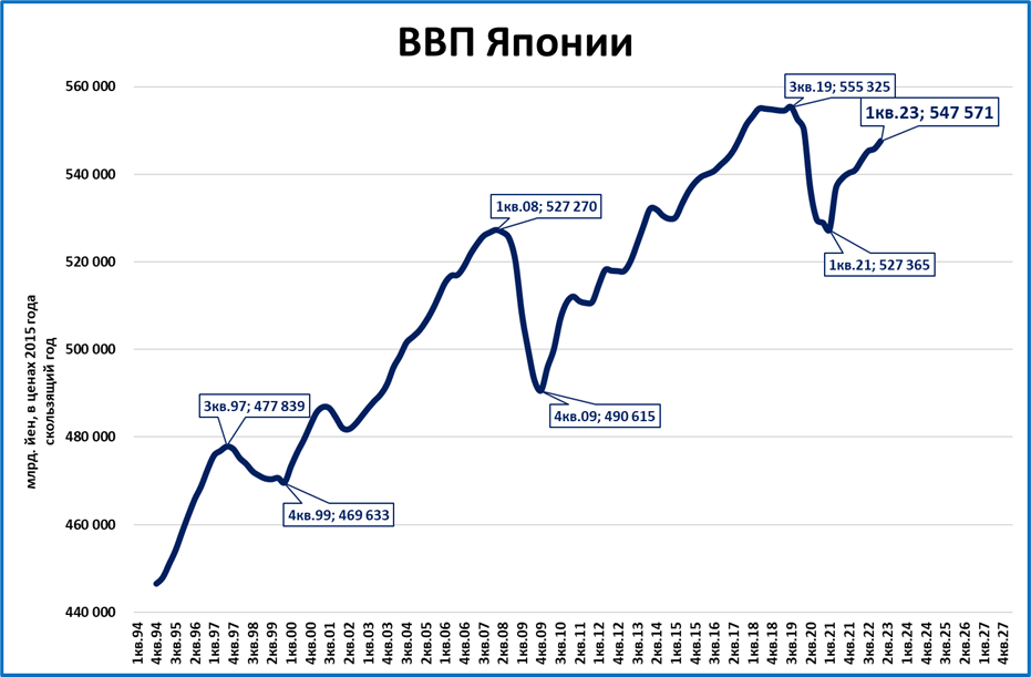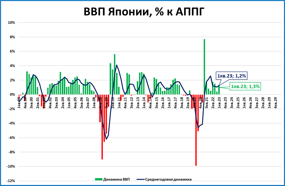 На темпах роста ВВП это пока не сказывается: в 1 квартале ВВП вырост на 1,3% по отношению к первому кварталу прошлого года. В Японии в последние 30 лет экономика растёт низкими темпами, порядка 0,9% в среднем в год. Поэтому такая динамика 1 квартала может считаться неплохой.