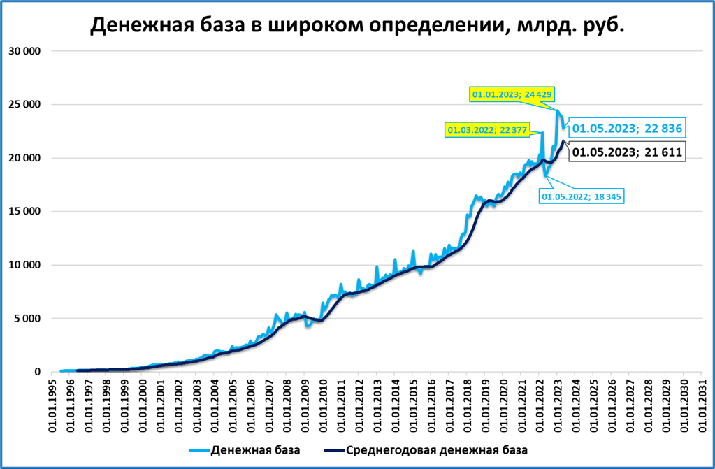 Широкая денежная база (или просто ДБ) на 1 мая составила 22,8 трлн рублей.