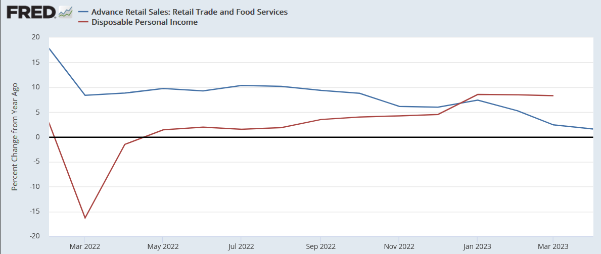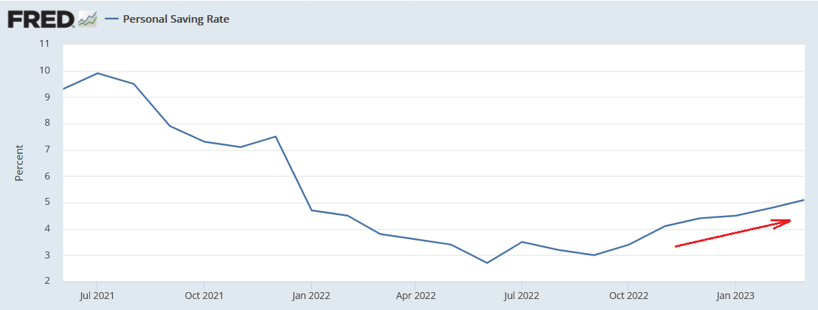 Во-первых, сбережения домохозяйств. Казалось бы, рост розничных продаж впервые с окончания коронавирусных локдаунов удалось охладить ниже 2% г/г (по итогам апреля 2023; в 1 кв. он составил 5%). Это большая победа ФРС над повышенным инфляционным давлением, и это один из (немногих) аргументов в пользу «паузы». Если учесть, что располагаемые доходы растут существенно быстрее, на 8,4% г/г, это должно транслироваться в резкий рост нормы сбережений домохозяйств. Что дало бы прямой эффект сокращения прибыли корпораций